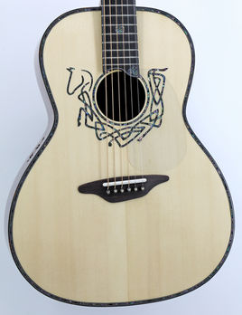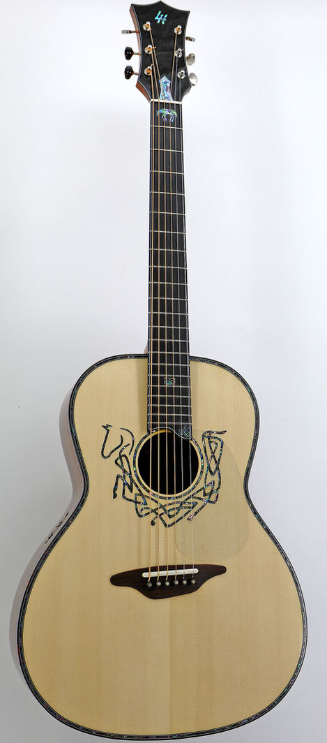 Special features – The guitar features abalone purfling on the top of the guitar, and an original design abalone Celtic horse rosette. We think the Celtic spiral in abalone at the end of the fingerboard is a nice touch. The guitar sports a rear access panel for easy interior access or viewing. Best of all, like all Lame Horse guitars, the playing action is easily adjusted on the fly under full string tension.